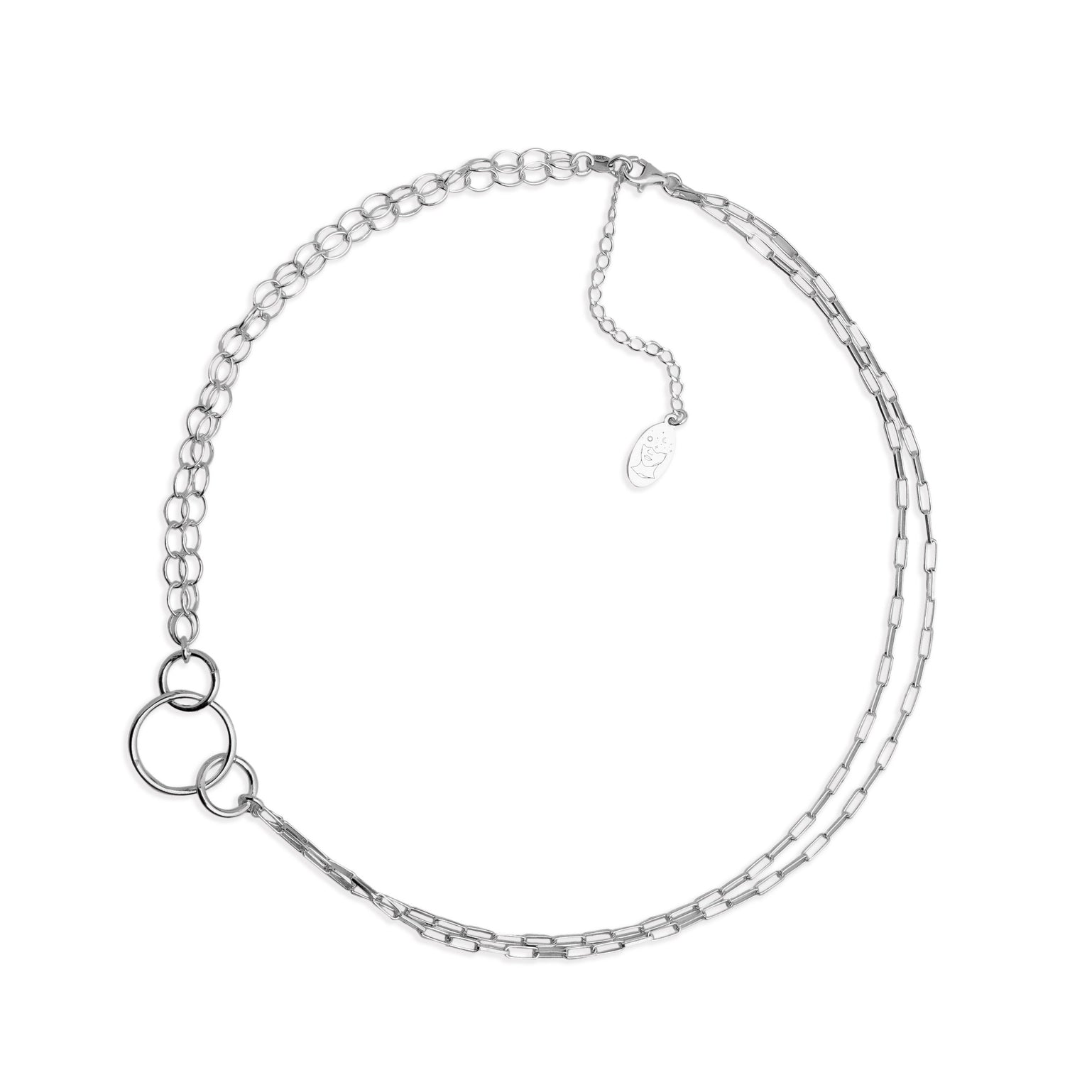 Detale: Kolia wykonana z różnych, ręcznie składanych elementów. Całkowita długość naszyjnika to 45cm, ale z możliwością zapinania na różnych długościach. Naszyjnik składa się z dwóch zupełnie różnych splotów łańcuszka - jeden owalny, drugi prostokątny. Podwójne łańcuszki złączone są trzema dużymi koluchami ze srebra, które tworzą główny punkt naszyjnika. Jest absolutnie piękny. Idealny jako prezent.